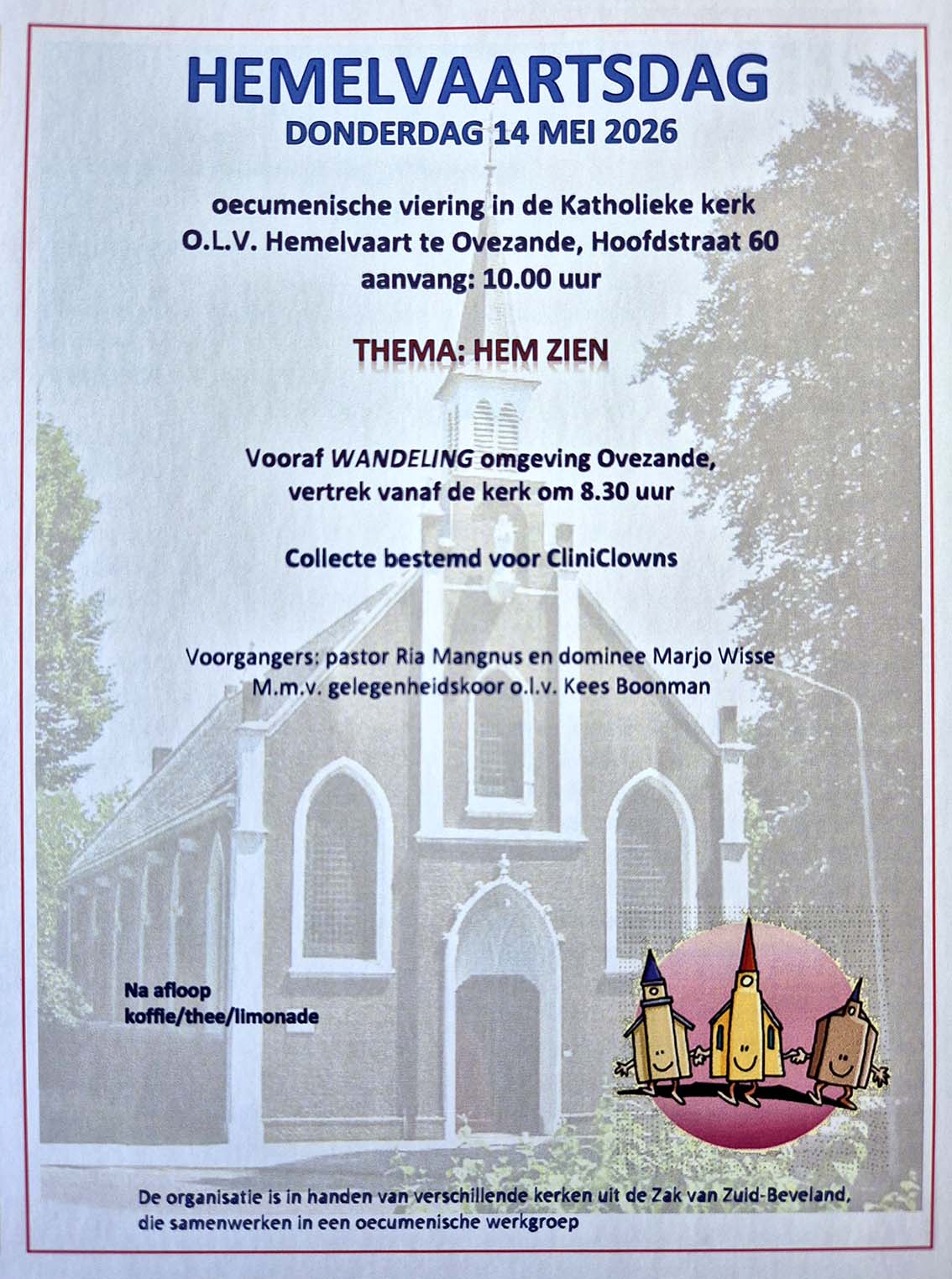 ![]() Voorafgaand aan de oecumenische viering is er een wandeling in de omgeving van Ovezande. Loopt u ook mee? | ||